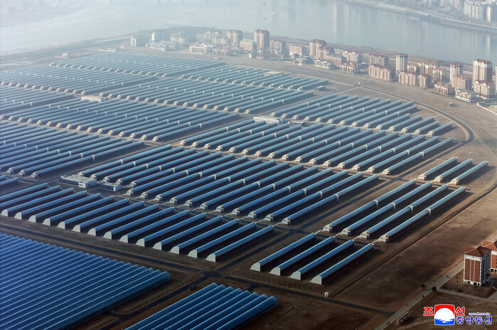 This photo, carried by North Korea's official Korean Central News Agency on Nov. 27, 2025, shows the construction site of a greenhouse farm in the northwestern city of Sinuiju the previous day as the North's leader Kim Jong-un visited the site, whose construction is nearing completion. (For Use Only in the Republic of Korea. No Redistribution) (Yonhap)