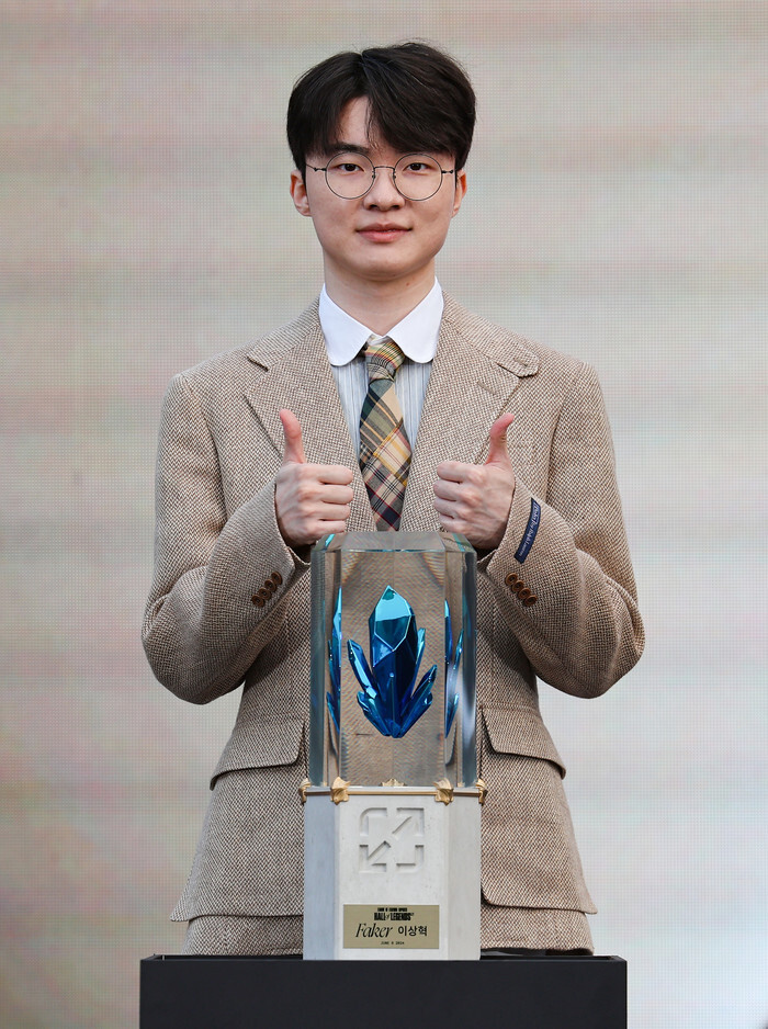 South Korean professional League of Legends player Lee Sang-hyeok, better known as Faker, poses for a photo during a media day event at a Seoul hotel on June 6, 2024, after becoming the first recipient of the Hall of Legends trophy, launched by American video game developer Riot Games. Lee won the LoL World Championship finals in 2013, 2015, 2016 and 2023. (Yonhap)