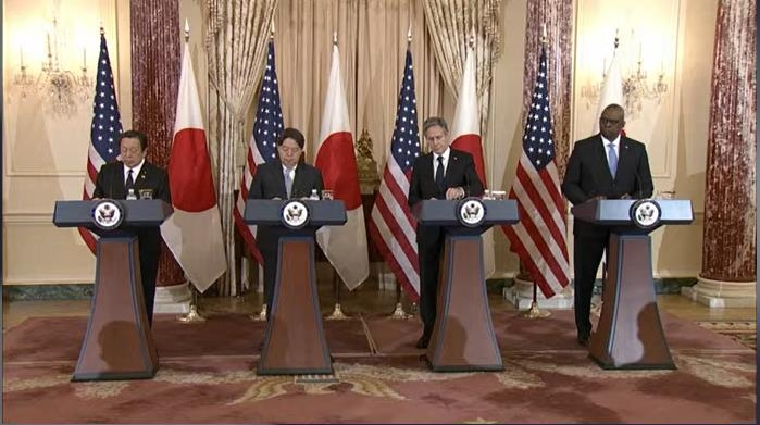 | ▲ The top diplomats of the United States and Japan are seen holding a joint press conference at the U.S. Department of State in Washington, D.C., on Jan. 11, 2023 in this captured image. They are (from R) U.S. Secretary of Defense Lloyd Austin, U.S. Secretary of State Antony Blinken, Japanese Foreign Minister Yoshimasa Hayashi and Japanese Defense Minister Yasukazu Hamada. (Yonhap) |