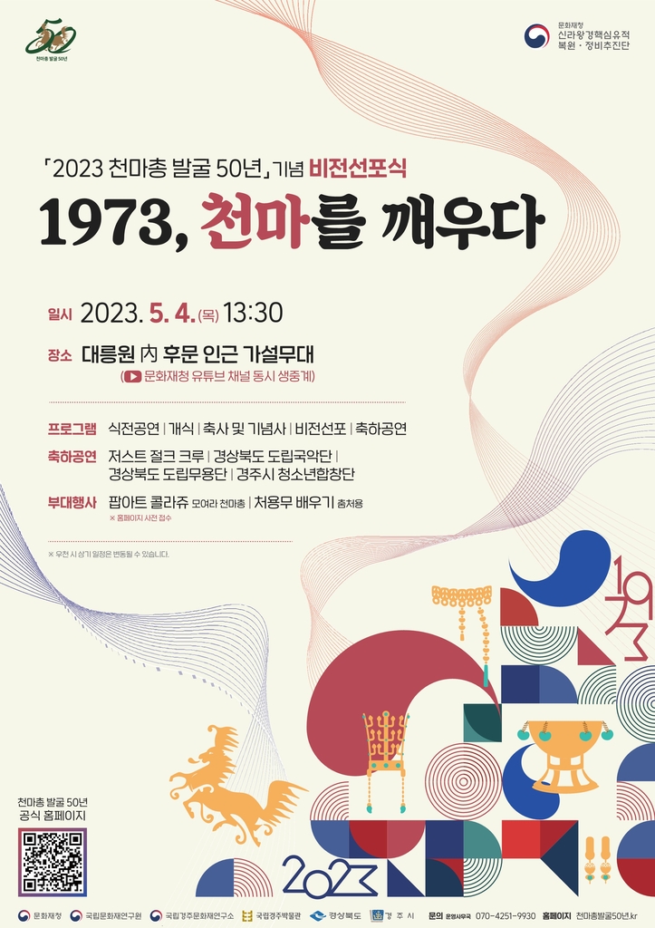 천마총 발굴을 계기로 지난 50년간 이뤄진 한국 고고학의 성장, 발굴 및 보존 처리 방법의 고도화, 유적 복원·정비 역량 강화 등 성과를 이어간다는 의미를 담았다고 문화재청은 전했다.