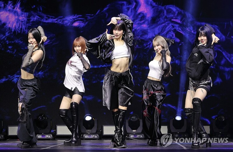 | ▲ 르세라핌, 신곡 '크레이지' 무대 공개 (서울=연합뉴스) 이재희 기자 = 그룹 르세라핌이 8월 29일 오후 서울 광진구 예스24라이브홀에서 열린 네 번째 미니앨범 '크레이지' 발표회에서 타이틀곡 '크레이지'를 선보이고 있다. 2024.8.29 scape@yna.co.kr |