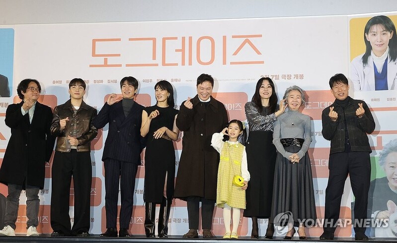 | ▲ 영화 '도그데이즈' 제작발표회 (서울=연합뉴스) 류효림 기자 = 김덕진 감독(왼쪽부터), 배우 탕준상, 이현우, 김서형, 정성화, 윤채나, 김윤진, 윤여정, 유해진이 10일 서울 용산구 CGV 용산점에서 열린 영화 '도그데이즈' 제작발표회에서 인사말을 하고 있다. 2024.1.10 ryousanta@yna.co.kr |