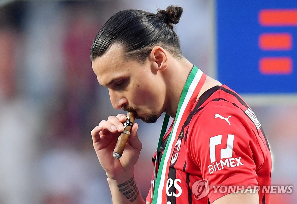 | ▲ '시가'로 우승 자축하는 AC밀란 이브라히모비치 (레조 에밀리아 로이터=연합뉴스) AC밀란의 즐라탄 이브라히모비치(40·스웨덴)가 22일(현지시간) 이탈리아 에밀리아로마냐주 사수올로의 마페이 스타디움에서 열린 이탈리아 세리에A 사수올로 대 AC밀란 경기에서 승리한 후 우승 세레머니에서 시가를 꺼내 들며 우승을 자축하고 있다. AC밀란은 이브라히모비치가 활약했던 2011년 세리에A에서 우승한 후 침체기를 겪으며 11년 동안 정규리그 우승을 하지 못했다. 그러나 2020년 이브라히모비치가 LA 갤럭시에서 복귀하며 리빌딩에 성공, 11년 만인 이번 시즌 리그 우승에 성공했다. 2022.5.23 alo95@yna.co.kr |