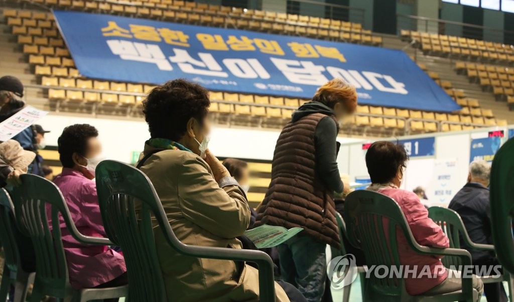 | ▲ Senior citizens aged 75 and above wait to receive COVID-19 jabs at a gym in Suwon, 46 kilometers south of Seoul, on April 7, 2021. (Yonhap) |
