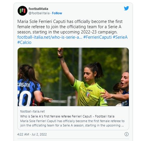 AP통신 등은 2일(한국시간) 마리아 솔레 페리에리 카푸티(32) 심판이 2022-2023시즌 이탈리아 세리에A 주심 팀으로 승격했다고 보도했다.