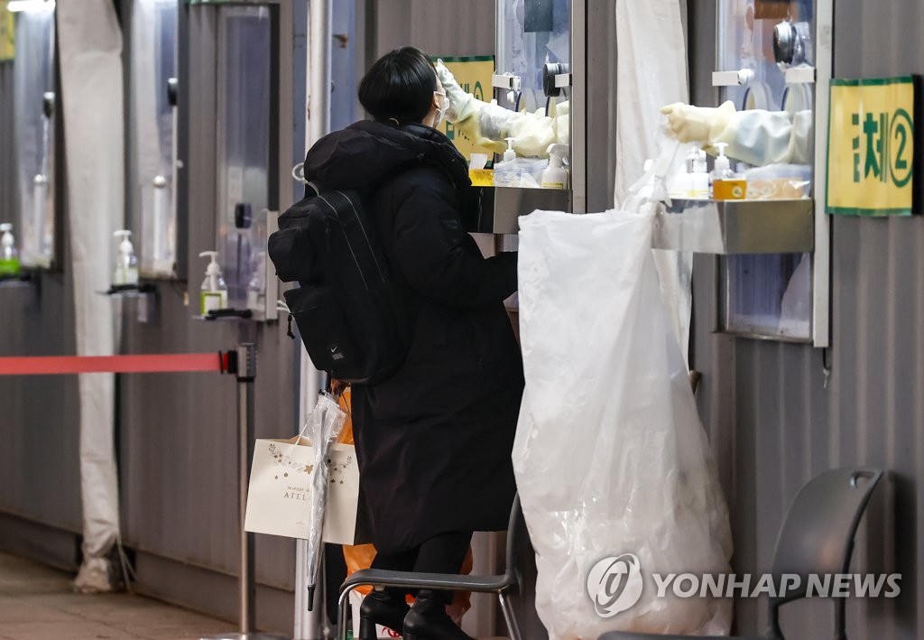 | ▲ A healthcare worker takes a nasal swab sample from a citizen holding a cakce for a COVID-19 test at a makeshift virus testing clinic in Seoul on Dec. 24, 2021. (Yonhap) |