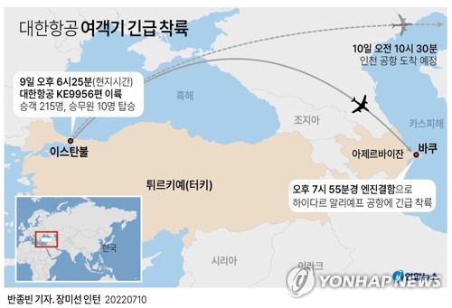 (서울=연합뉴스) 장하나 기자 = 9일 오후(현지시간) 튀르키예(터키) 이스탄불을 출발해 인천국제공항으로 향하던 대한항공 여객기가 엔진 결함으로 아제르바이잔 수도 바쿠에 긴급 착륙하며 탑승객이 큰 불안을 겪는 일이 발생했다.