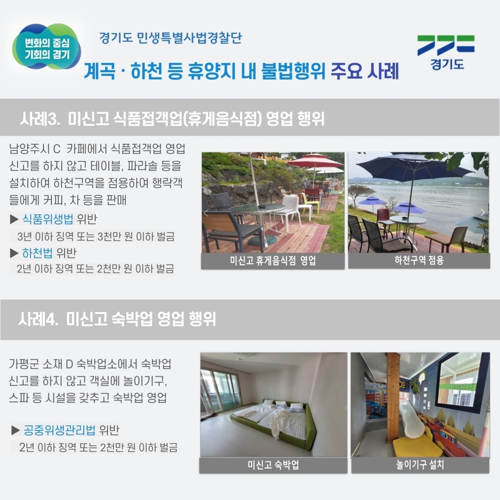 남양주시 C 카페는 식품접객업 영업 신고를 하지 않고 북한강변에 테이블과 파라솔을 설치하고 영업을 해왔으며, 가평군 휴양지 내 D 숙박업소는 객실에 놀이기구, 스파 등 미신고 시설을 갖추고 영업을 하다가 적발됐다.