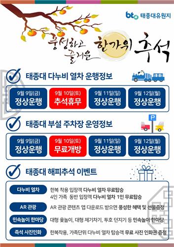 추석 연휴인 9일부터 12일까지 태종대 유원지를 방문한 관광객을 대상으로 한복을 입은 관광객과 4인 동반가족을 대상으로 다누비 열차 무료 탑승 혜택을 제공한다.
