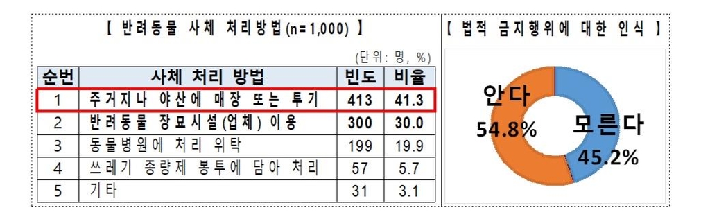조사 결과 소비자들은 사체를 주로 '주거지나 야산에 매장 또는 투기했다'(41.3%)고 답했고, 이런 행위가 불법이라는 사실에 대해서는 45.2%가 몰랐다고 응답했다.