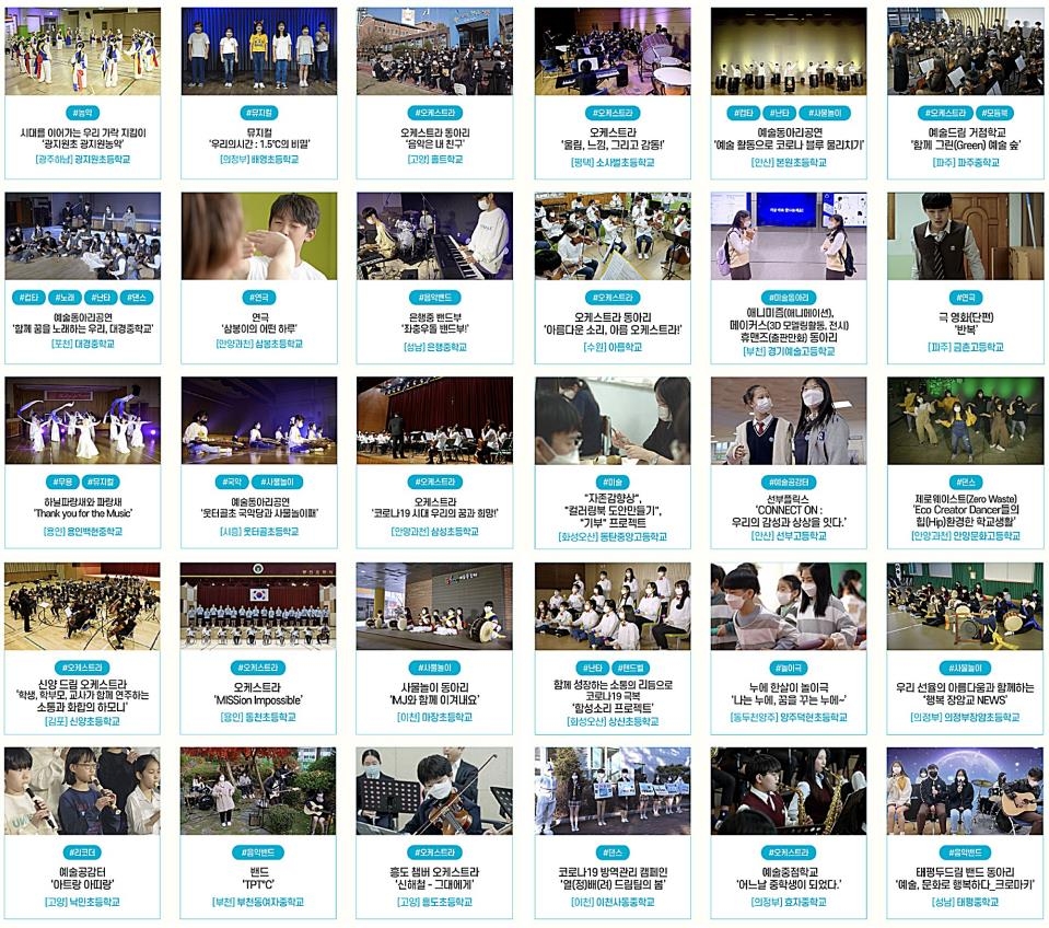 이를 위해 유튜브 채널 '경기도교육청TV'에 '예술 공감터'를 구축했으며 경기지역 초등학교 15곳, 중학교 8곳, 고등학교 5곳, 특수학교 2곳 등 총 30개교가 참여했다.
