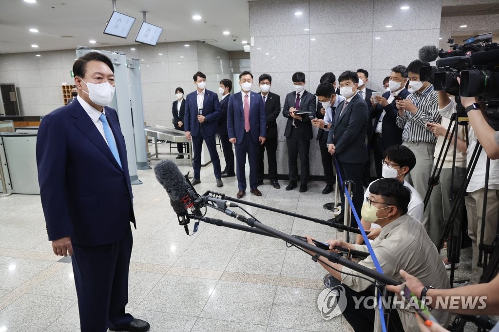| ▲ President Yoon Suk-yeol takes reporters' questions as he arrives at the presidential office in Seoul on June 14, 2022. (Yonhap) |