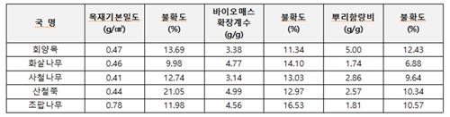수종별 탄소흡수계수를 보면 목재기본밀도의 경우 조팝나무가 0.78g/㎤로 가장 높았고, 회양목 0.47g/㎤, 화살나무 0.46g/㎤, 산철쭉 0.44g/㎤, 사철나무 0.41g/㎤ 순이었다.
