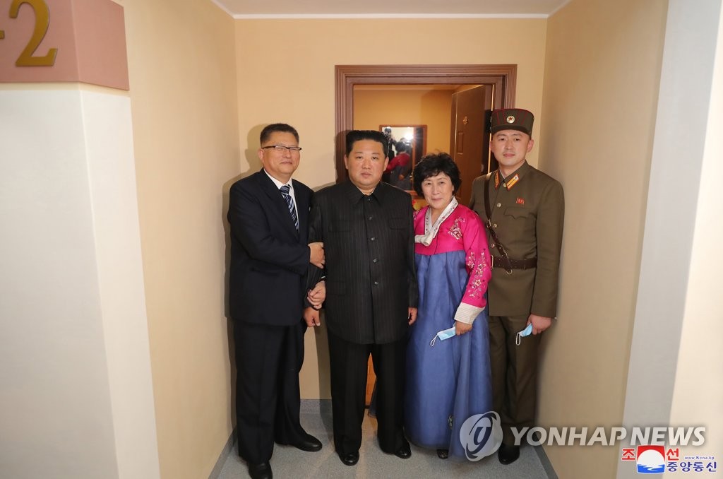 | ▲ This file photo, provided by North Korea's state-run Korean Central News Agency on April 14, 2022, shows the North's leader Kim Jong-un (2nd from L) posing for a photo with Tong Thae-gwan (L), an editorial writer of the Rodong Sinmun, and his family members in a new riverside apartment in Pyongyang. (For Use Only in the Republic of Korea. No Redistribution) (Yonhap) |