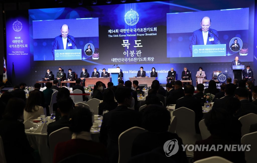(서울=연합뉴스) 이은정 기자 = 개신교계 연례행사인 국가조찬기도회가 국가 지도자와 교계 인사 등 1천여 명이 참석한 가운데 3년 만에 현장 기도회로 개최됐다.