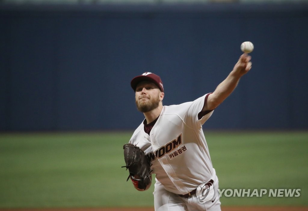 ▲ In this file photo from March 16, 2021, Eric Jokisch of the Kiwoom Heroes pitches against the LG Twins during a Korea Baseball Organization spring training game at Gocheok Sky Dome in Seoul. (Yonhap)