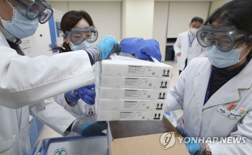 ▲ Health care workers carry boxes containing Pfizer Inc.'s COVID-19 vaccine at a hospital in the southeastern port city of Busan on Feb. 26, 2021. (Yonhap)