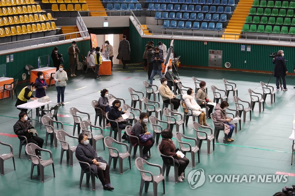 ▲ Employees working at nursing homes wait to receive a shot of AstraZeneca's COVID-19 vaccine at a gym in the southwestern city of Yeosu on Feb. 26, 2021. (Yonhap)