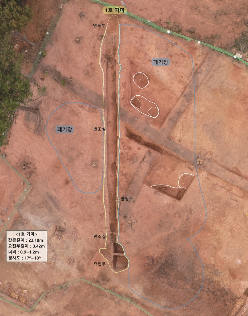 가마는 길이 23m인 중형 진흙 가마 1기와 이보다 작은 길이 10m 안팎의 소형 진흙 가마 1기, 4.5m 길이의 지하식 가마 1기로 조사됐다.