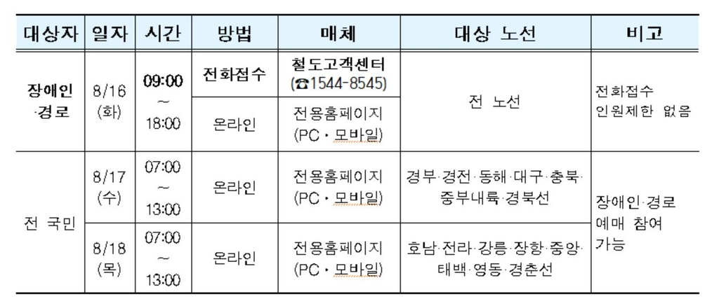 17일에는 경부·경전·동해·충북·중부내륙·경북선 승차권, 18일엔 호남·전라·강릉·장항·중앙·태백·영동·경춘선 승차권 예매를 진행한다.