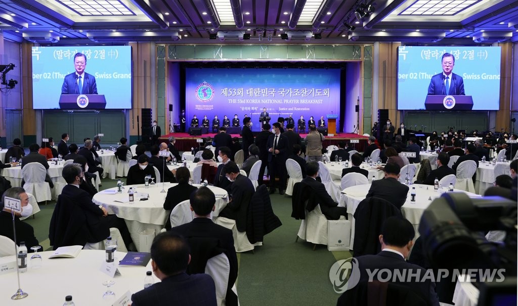 (서울=연합뉴스) 양정우 기자 = 개신교계 연례행사로 50년 넘게 이어온 국가조찬기도회가 '코로나19' 사태 장기화 속에 온·오프라인으로 동시 개최됐다.
