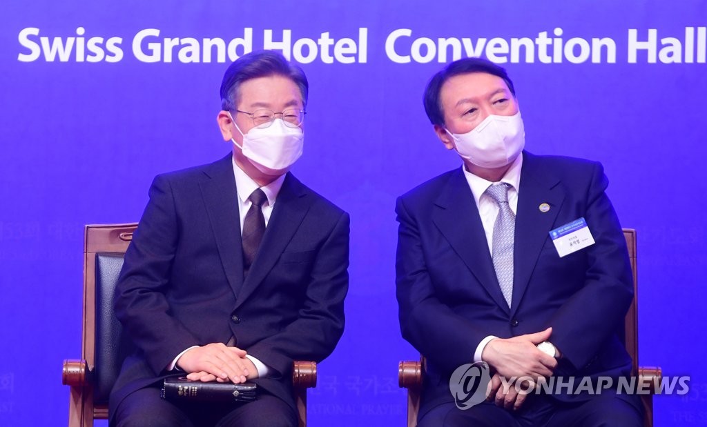 | ▲ 이재명ㆍ윤석열, 국가조찬기도회 참석 (서울=연합뉴스) 더불어민주당 이재명 대선 후보와 국민의힘 윤석열 대선 후보가 2일 오전 서울 서대문구 스위스그랜드호텔 컨벤션센터에서 열린 제53회 대한민국 국가조찬기도회에 참석해 있다. 2021.12.2 [국회사진기자단] uwg806@yna.co.kr |