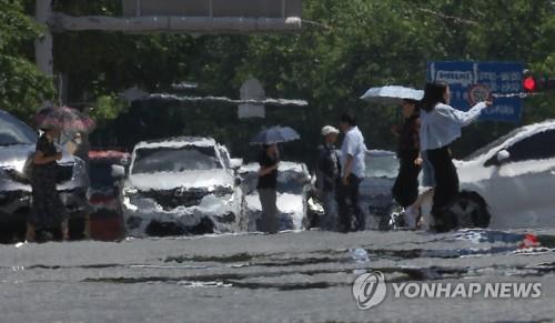 | ▲ People walk across a road in the southeastern city of Daegu on Aug. 3, 2023, over which the air shimmers as a heat wave continues to grip South Korea. (Yonhap) |