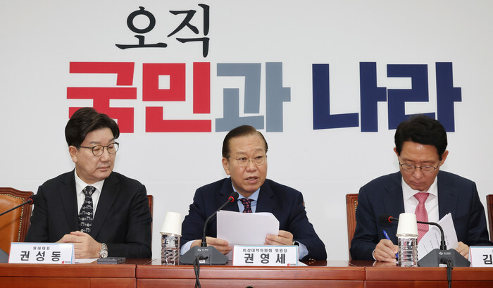 Kwon Young-se (C), chief of the ruling People Power Party's emergency leadership committee, speaks during a meeting of the committee at the National Assembly in Seoul on March 13, 2025. (Yonhap)