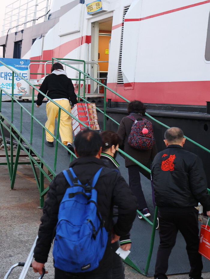 Holidaymakers board a ferry bound for the northernmost front-line island of Baengnyeong at a passenger terminal in the coastal city of Incheon, west of Seoul, on Jan. 24, 2025, the eve of a six-day break for Seol, Lunar New Year's Day. The holiday, which runs from Jan. 25-30 this year, is a time for family reunions, with Koreans traditionally offering a ritual feast to their ancestors. (Yonhap)
