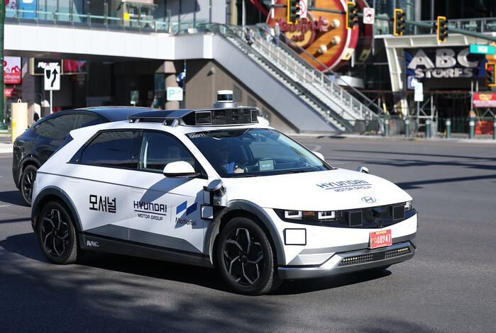 An Ioniq 5 robotaxi, a Hyundai Motor Group-backed fully driverless vehicle, test-drives on a road in Las Vegas, Nevada, on Jan. 8, 2026. The vehicle, based on the South Korean automaker's Ionic 5 electric car, and jointly developed by Hyundai and its U.S.-based autonomous driving joint venture, Motional, will be put into commercial service this year. (Yonhap)