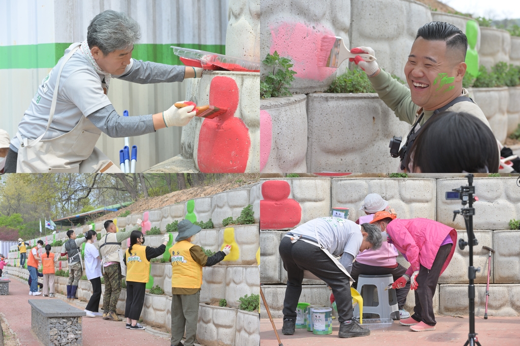 한 손에는 페인트 통, 한 손에는 붓을 든 사람들은 회색빛이 감도는 마을회관 옆 벽을 1시간도 채 되지 않아 빨간색, 분홍색, 초록색으로 알록달록 화사하게 물들였다.