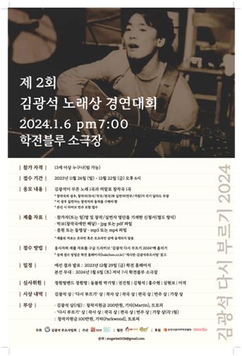 (서울=연합뉴스) 이태수 기자 = 다음 달 6일 서울 학전블루 소극장에서 '제2회 김광석 노래상 경연대회' 본선 무대가 열린다고 김광석추모사업회가 18일 밝혔다.