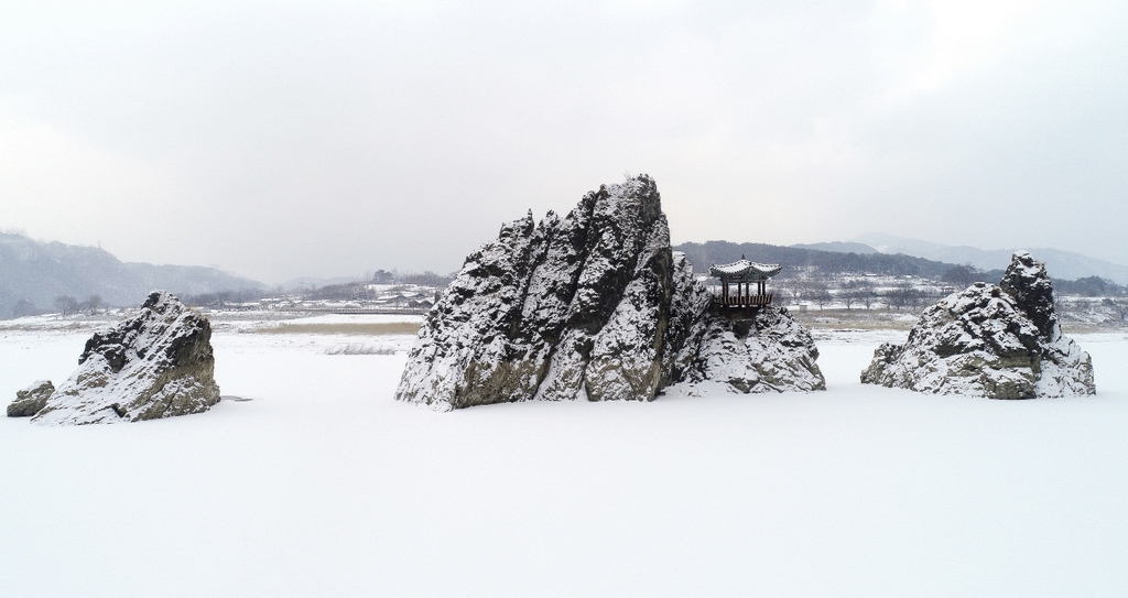 (단양=연합뉴스) 충북 단양군의 명물인 도담삼봉과 주변이 '새하얀 세상'으로 변했다.