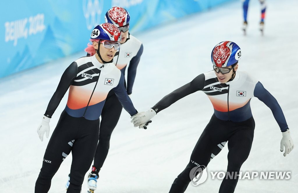 | ▲ [올림픽] 올림픽 마무리 하는 곽윤기 (베이징=연합뉴스) 홍해인 기자 = 곽윤기(왼쪽)가 16일 중국 베이징 캐피털 실내 경기장에서 열린 2022 베이징 동계올림픽 쇼트트랙 남자 5000m 계주 결승에서 은메달을 차지한 뒤 아쉬운 표정으로 링크를 돌자 황대헌이 다가와 손을 잡고 있다. 2022.2.17 hihong@yna.co.kr |