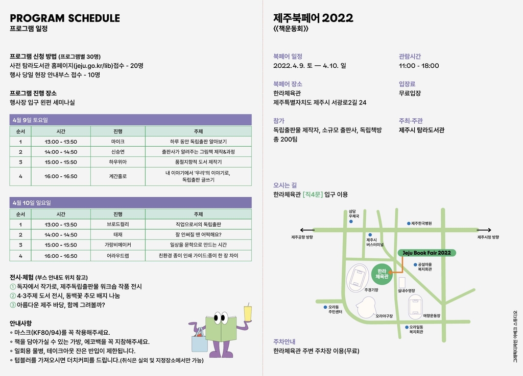행사를 주관하는 탐라도서관 관계자는 "'제주북페어 2022 책운동회' 개최를 통해 시민들이 현재 책문화 흐름을 이해하고 다양한 판형의 독립출판물을 접할 기회가 만들어지길 기대한다"며 제주시민들의 많은 관심과 참여를 당부했다.