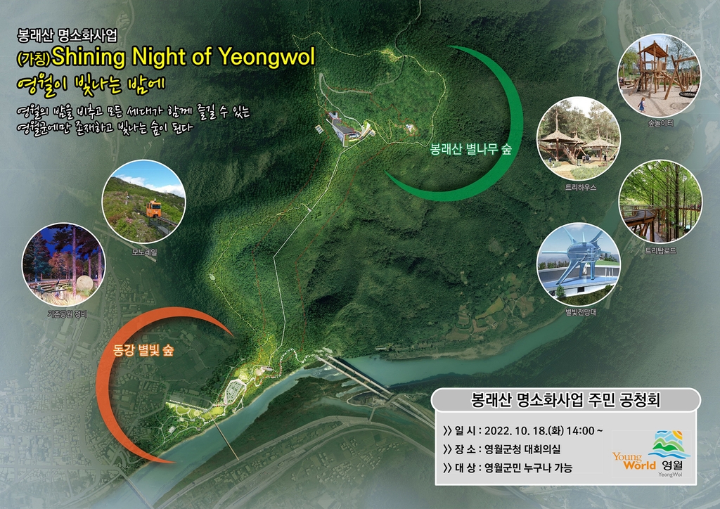 영월군은 18일 군청 대회의실에서 전망시설 및 모노레일 설치에 대한 사업 설명, 비전 제시, 의견 수렴 등을 위한 봉래산 명소화 사업 주민 공청회를 개최한다.