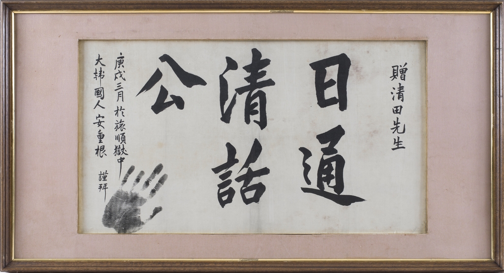 안중근 유묵들은 중국 뤼순 감옥에서 순국하기 직전인 1910년 3월에 남긴 것으로, 안중근 손도장과 "안중근이 썼다"는 문구가 남아 있다.