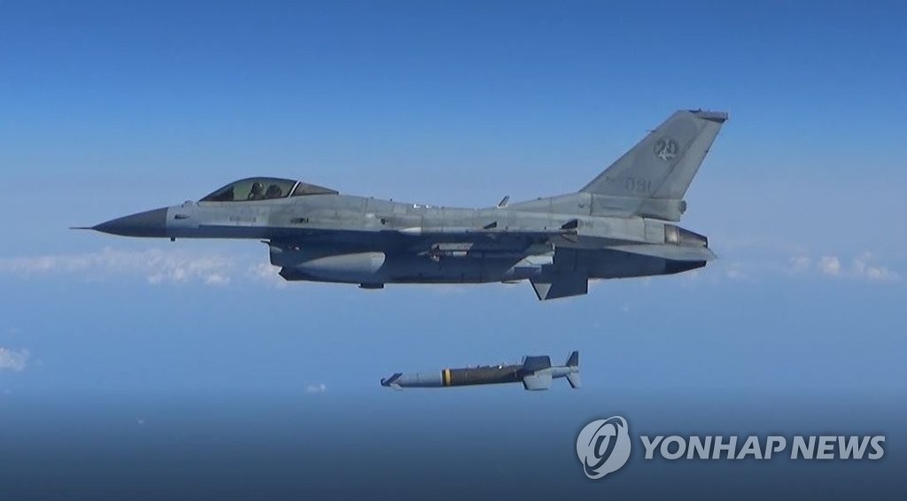 | ▲ 스파이스 2000 유도폭탄 발사하는 KF-16 전투기 (서울=연합뉴스) 공군 KF-16 전투기가 2일 동해상에서 북방한계선(NLL) 이북을 향해 스파이스 2000 유도폭탄을 발사하고 있다. 합참은 이날 오전 북한이 NLL 이남으로 탄도미사일을 발사한 데 대응해 사격한 것이라고 설명했다. 2022.11.2 [합참 제공. 재판매 및 DB 금지] photo@yna.co.kr |