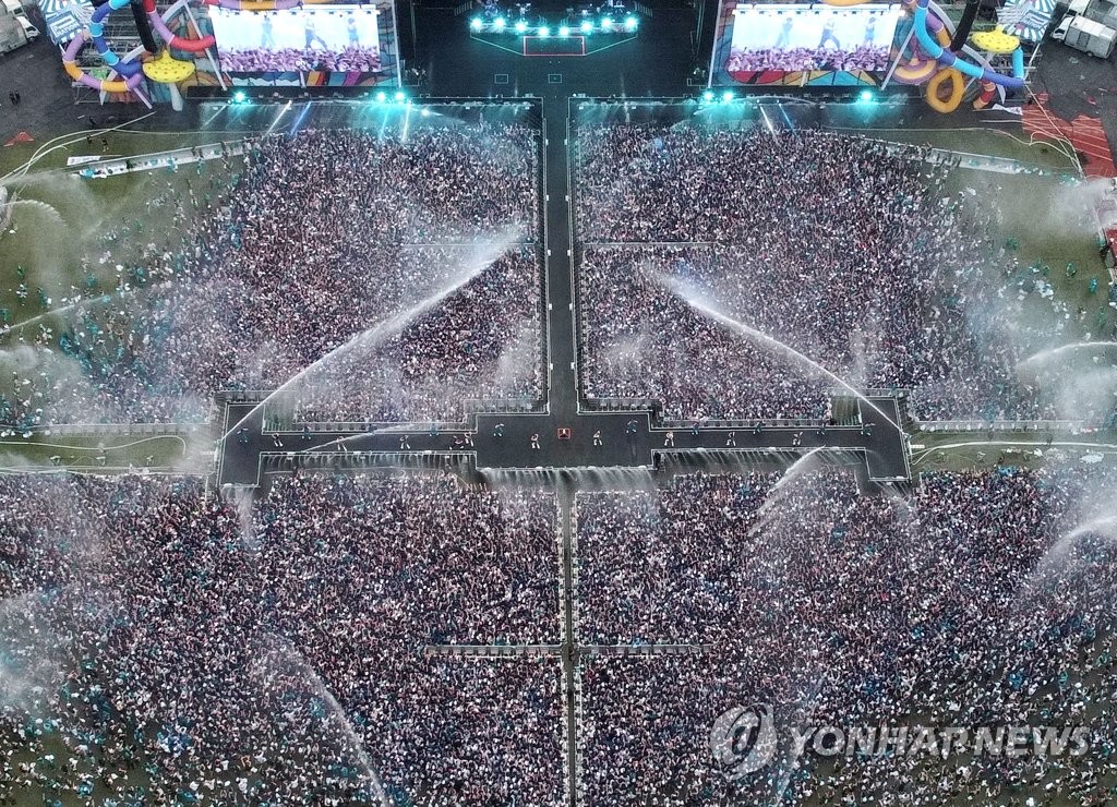 | ▲ 올림픽주경기장 '흠뻑' 작년 7월 잠실 올림픽주경기장에서 열린 가수 싸이의 콘서트 '싸이흠뻑쇼 2022'에서 관객들이 물줄기를 맞으며 공연을 즐기는 모습. [연합뉴스 자료사진] |