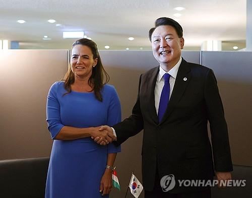 ▲ President Yoon Suk Yeol (R) shakes hands with Hungarian President Katalin Novak in New York on Sept. 20, 2023 (local time). (Yonhap)