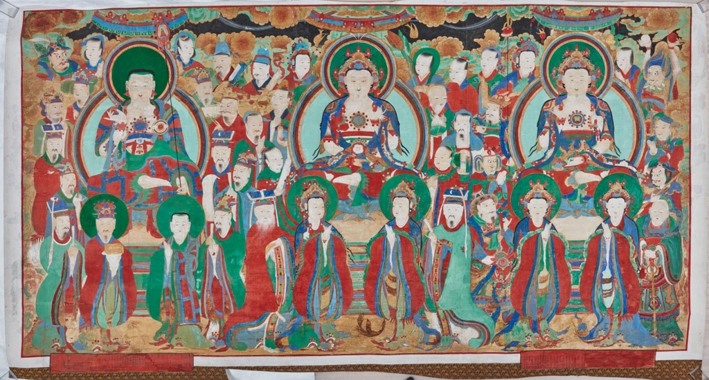(서울=연합뉴스) 김예나 기자 = 경북 포항 보경사 팔상전에 있던 '영산회상도'(靈山會上圖)는 비단 바탕에 붉은색과 녹색을 주로 사용해 부처와 보살을 담은 불화다.
