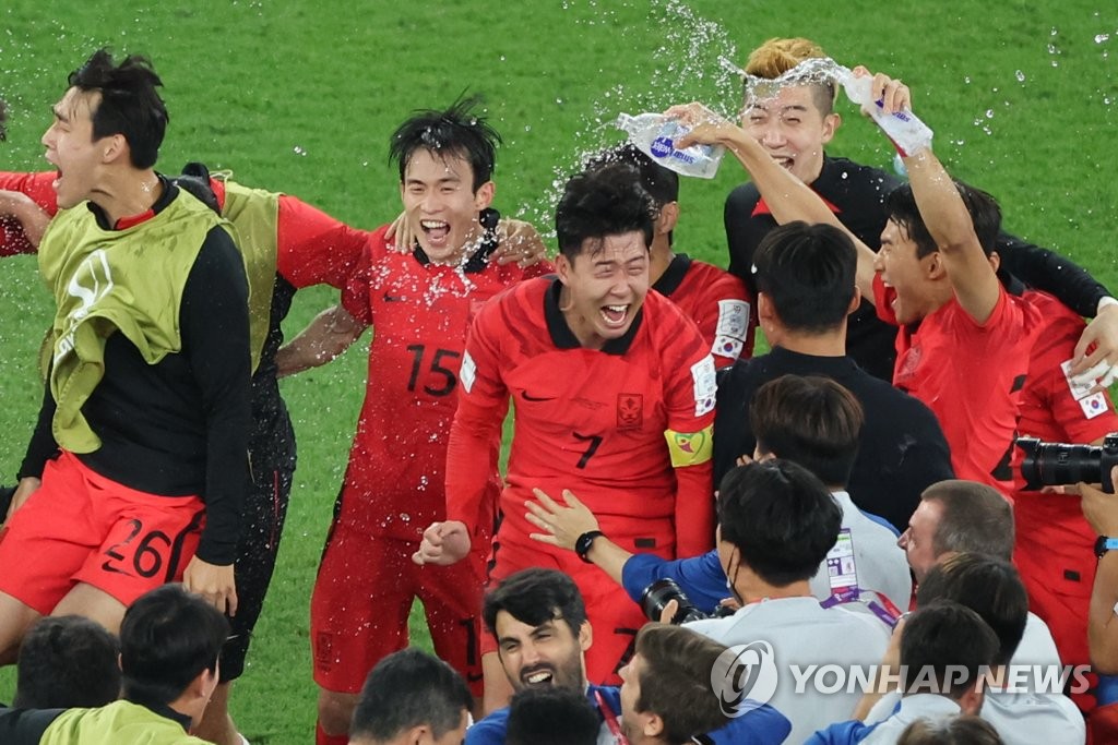 | ▲ '알라이얀의 기적' (알라이얀=연합뉴스) 김주성 기자 = 3일 오전(한국시간) 카타르 알라이얀의 에듀케이션 시티 스타디움에서 열린 2022 카타르 월드컵 조별리그 H조 3차전 대한민국과 포르투갈 경기. 손흥민 등 선수들이 16강 진출에 성공하자 동료 선수들과 환호하고 있다. 2022.12.3 utzza@yna.co.kr |