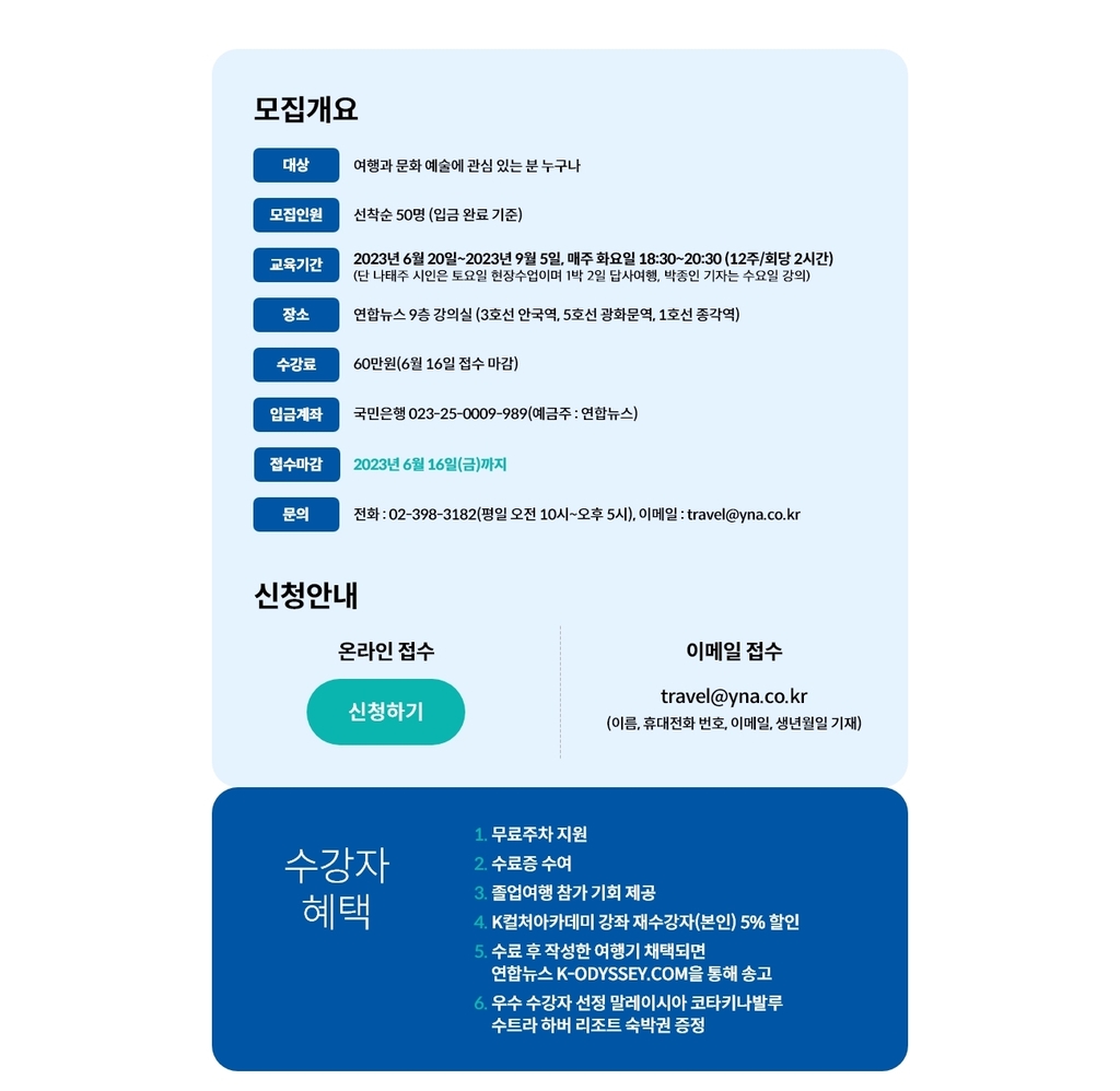 (서울=연합뉴스) 정주원 기자 = 연합뉴스 K컬처아카데미가 '여행자학교' 4기 강좌를 마련, 수강생을 모집한다고 22일 밝혔다.