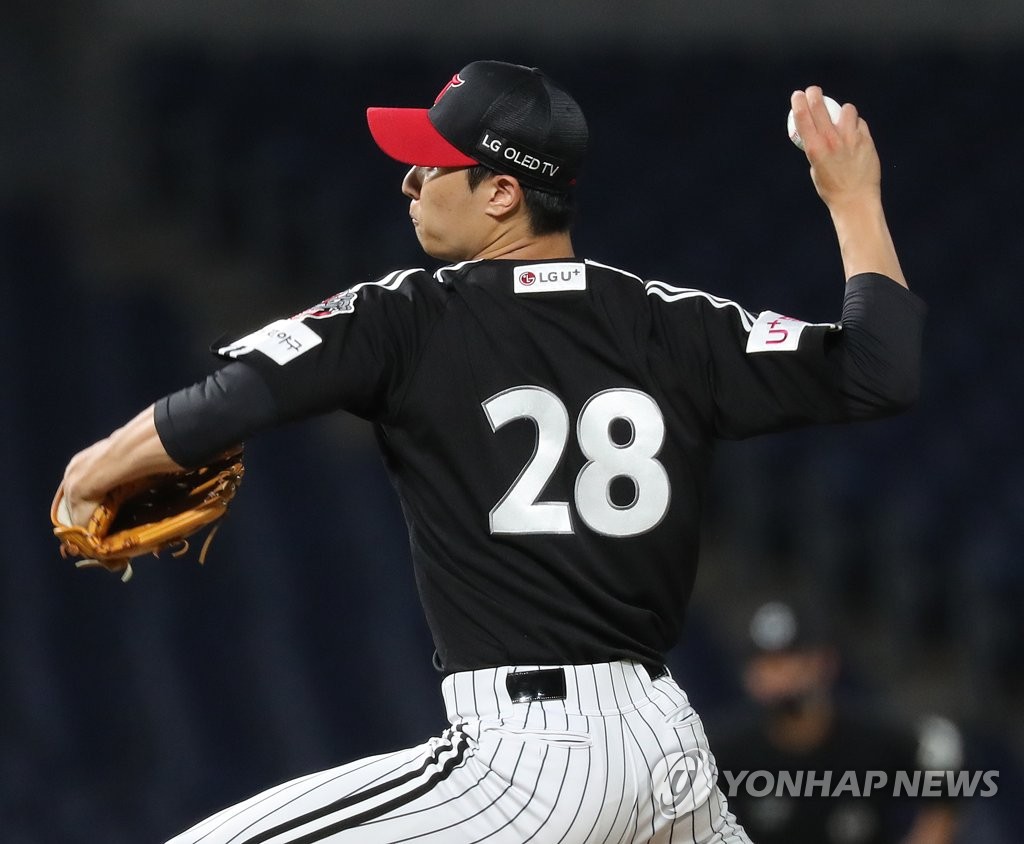 ▲ In this file photo from Aug. 14, 2020, Yi Jung-yong of the LG Twins pitches against the NC Dinos in the bottom of the eighth inning of a Korea Baseball Organization regular season game at Changwon NC Park in Changwon, 400 kilometers southeast of Seoul. (Yonhap)