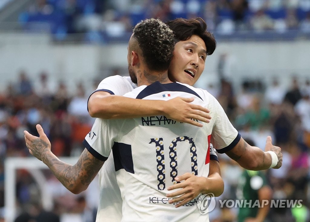 | ▲ 네이마르와 포옹하는 이강인 (부산=연합뉴스) 김성민 기자 = 3일 오후 부산아시아드주경기장에서 열린 '쿠팡플레이 시리즈 3차전' 파리 생제르맹(PSG) 대 K리그1 전북 현대 경기. PSG 이강인이 골을 넣은 네이마르와 포옹하고 있다. 2023.8.3 ksm7976@yna.co.kr |