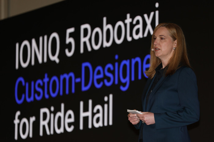 Laura Major, chief of Hyundai Motor Group's U.S.-based autonomous driving joint venture, Motional, speaks during a press conference at its technical center in Las Vegas, Nevada, on Jan. 8, 2026, about the Ioniq 5 robotaxi, a Hyundai Motor Group-backed fully driverless vehicle. The vehicle, based on the South Korean automaker's Ionic 5 electric car, and jointly developed by Hyundai and Motional, will be put into commercial service this year. (Yonhap)