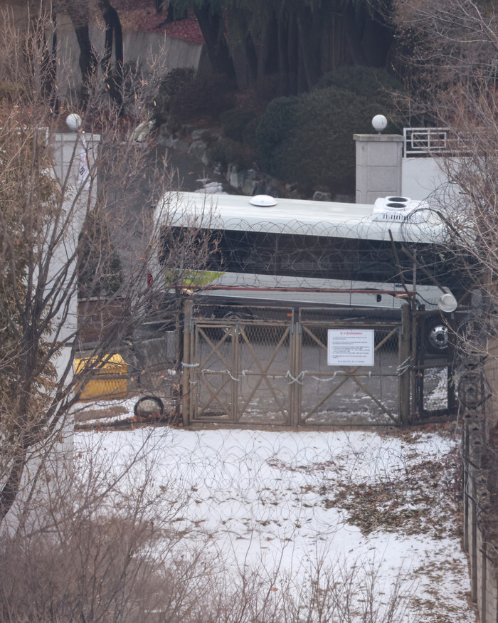Chains are seen to have been added to a gate of a barbed-wire fence leading to the official residence of impeached President Yoon Suk Yeol in Seoul on Jan. 8, 2025, one day after investigators led by the Corruption Investigation Office for High-ranking Officials were granted an extension of a warrant to detain Yoon over his short-lived imposition of martial law. (Yonhap)