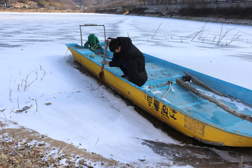 호수 기슭의 어선들은 얼음에 갇혀 옴짝달싹 못한다. 주민들이 대청호를 건널 때 쓰는 도선도 운행을 중단했다.