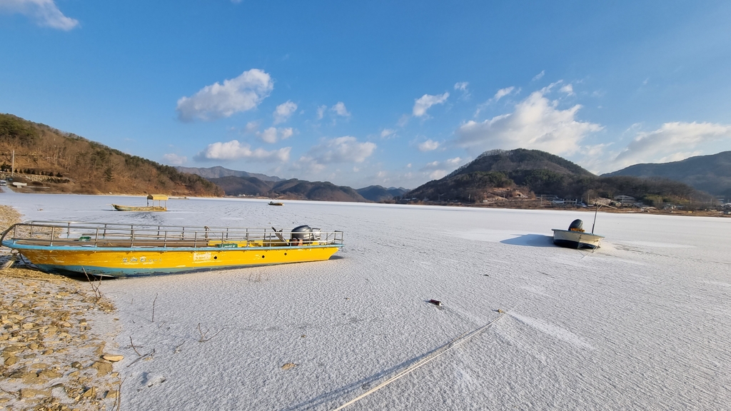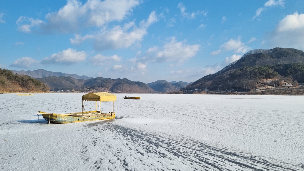 (옥천=연합뉴스) 충북 옥천군 동이면 석탄리 앞 대청호가 한파에 꽁꽁 얼어붙으면서 어선들이 오도 가도 못하는 신세가 됐다.