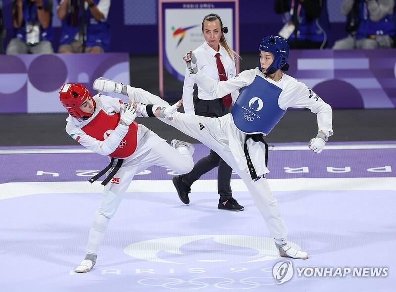 | ▲ Kim Yu-jin of South Korea (R) battles Nahid Kiani of Iran in the final of the women's -57-kilogram taekwondo event at the Paris Olympics at Grand Palais in Paris, in this file photo from Aug. 8, 2024. (Yonhap) |